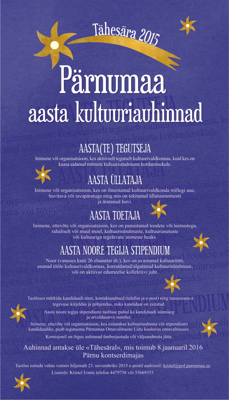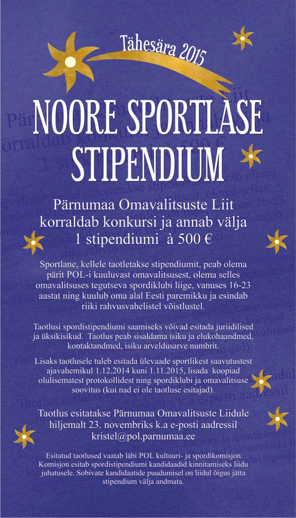 Taotlused esitada hiljemalt 23.novembril 2015 e-posti aadressil kristel@pol.parnumaa.ee .