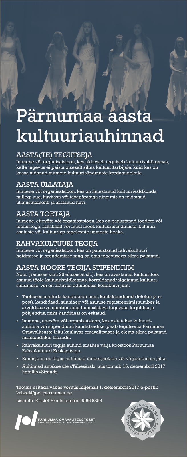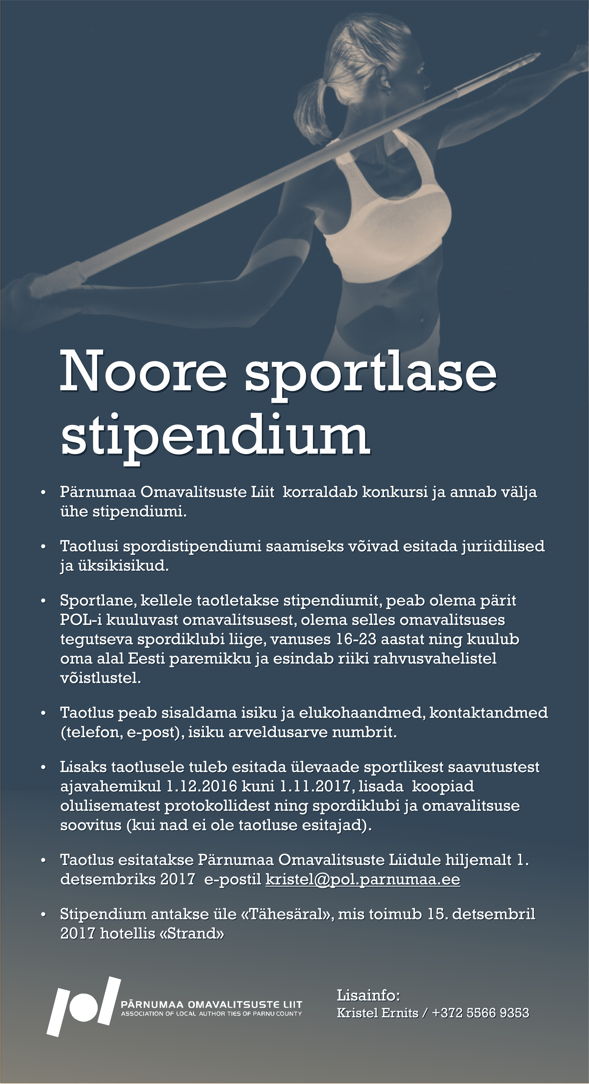 Taotlused esitada e-postil kristel(ät)pol.parnuma.ee hiljemalt 1.detsembril 2017.